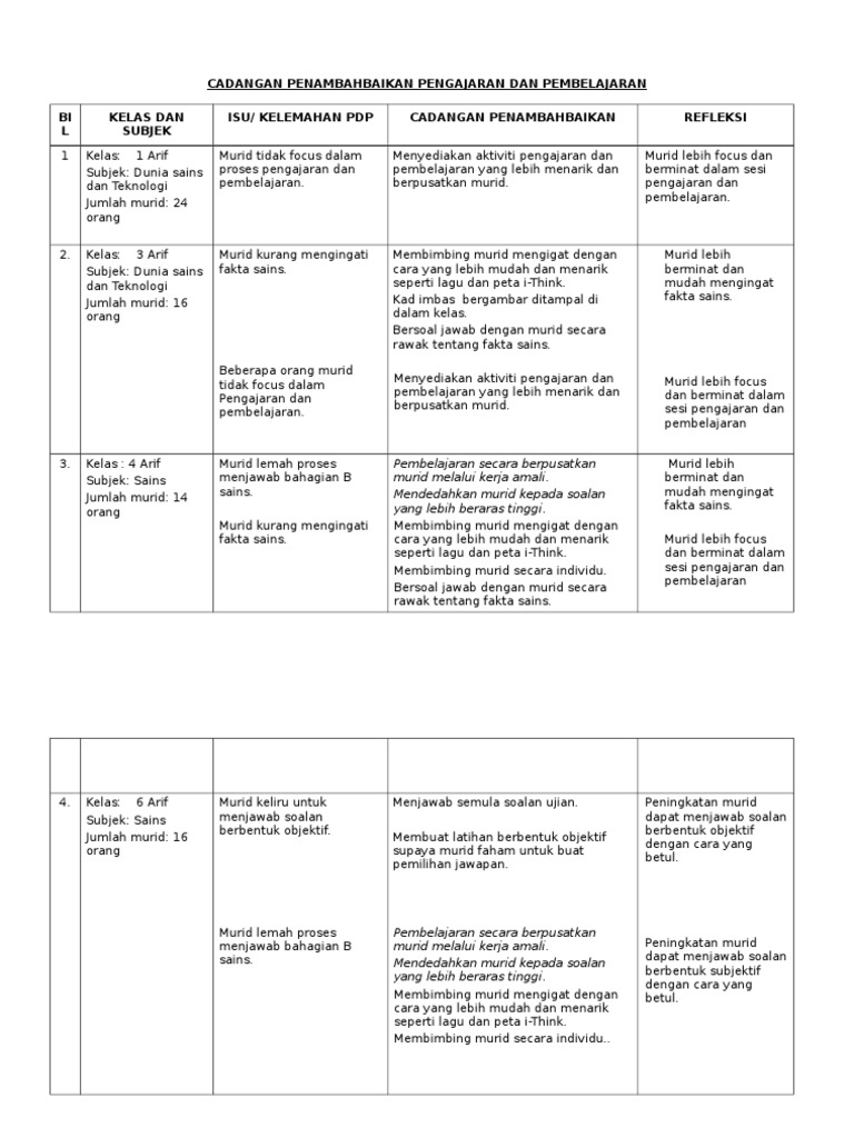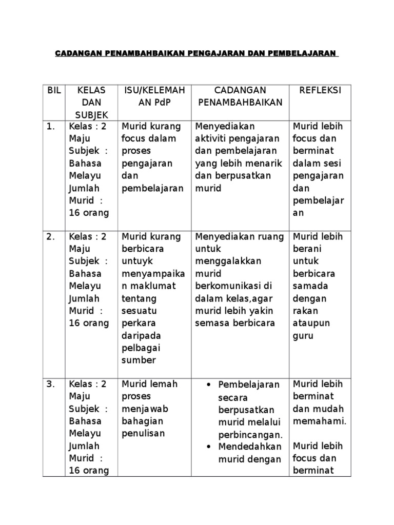 Cadangan Penambahbaikan Pengajaran Dan Pembelajaran